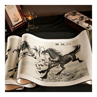在中国现代绘画史上,徐悲鸿的马独步画坛。《八骏图》为其最著名的作品之一,以周穆王八骏为题材,八匹马形态各异,飘逸灵动,犹如神骏。《八骏图》用墨酣畅淋漓,用笔刚健有力,成功描绘了马的飒爽英姿。真丝彩印长卷《八骏图》采用我公司独创的“高分辨率全彩色真丝彩印技术”精制而成,完美再现了徐悲鸿所绘《八骏图》的神韵,具有极高的欣赏和收藏价值。